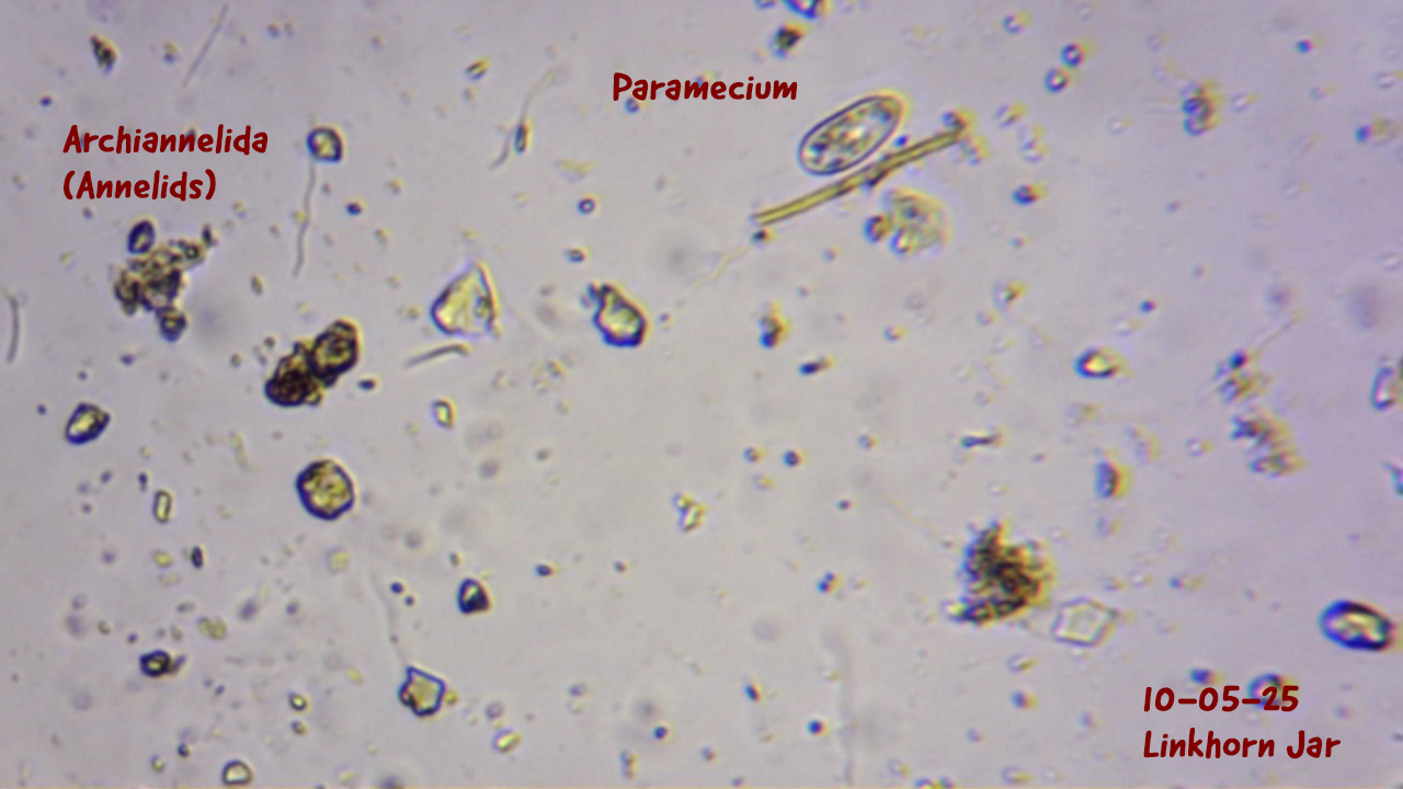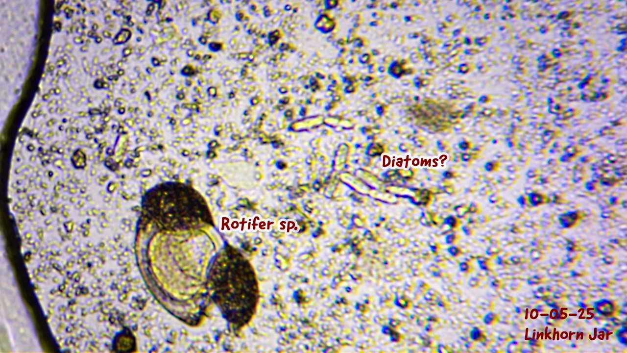 Yesterday, I took some samples and observed paramecia, some rotifers, and a bit of bacteria in there. I’ll try to post those observations to this log as well. Later, after I finish my household chores, I’ll post an update about the samples I took today.